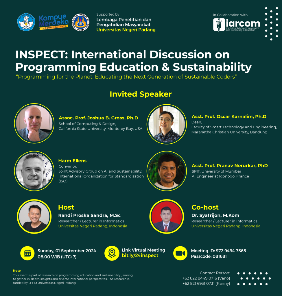 Padang, September 1, 2024 – The research team from Universitas Negeri Padang (UNP), comprising Randi Proska Sandra, S.Pd, M.Sc (Chair), Dr. Syafrijon, M.Kom (Member), and Sari Nova, M.Sc (Member), successfully organized an online event titled “INSPECT: International Discussion on Programming Education and Sustainability.” This event was a Focus Group Discussion (FGD) as part of a research series under the Young Lecturer Research Fund scheme, funded by the RKAT of Universitas Negeri Padang.